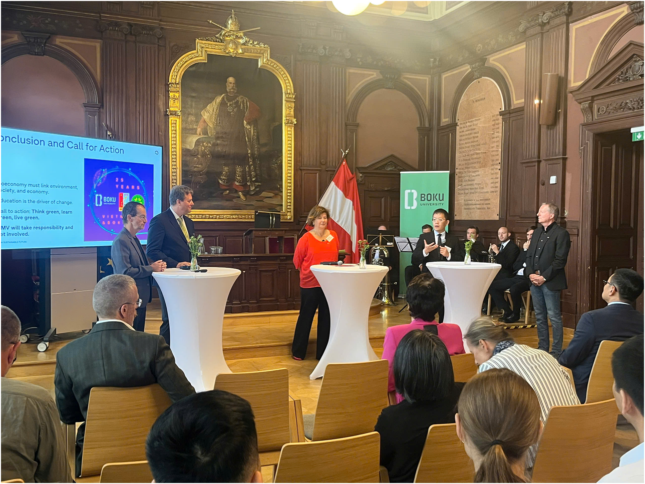 Buổi lễ tiếp nối với tọa đàm “BioEconomy, đổi mới xanh và hợp tác đào tạo hướng đến 2030”, quy tụ các nhà khoa học HUST và BOKU. Với tinh thần “Think green, learn green, live green”, các đại biểu đã thảo luận về vai trò của giáo dục trong thúc đẩy phát triển bền vững. PGS. Chu Kỳ Sơn bày tỏ mong muốn áp dụng kinh nghiệm phát triển xanh của Áo tại Việt Nam, góp phần hỗ trợ chiến lược chuyển đổi xanh.