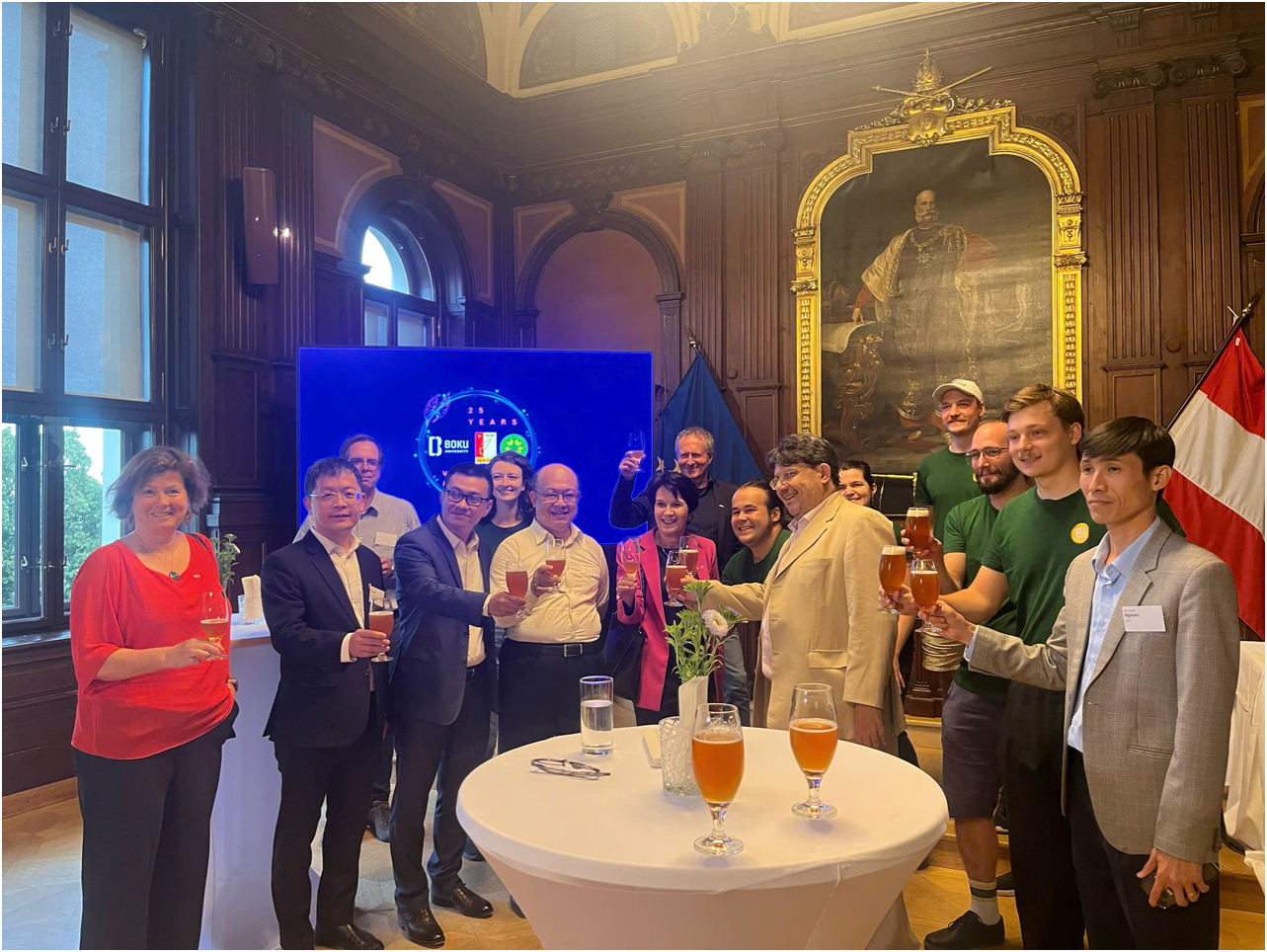 Các đại biểu tham dự lễ kỷ niệm nâng ly bia VN-A – sản phẩm hợp tác nghiên cứu giữa hai trường BOKU và HUST để chúc mừng.