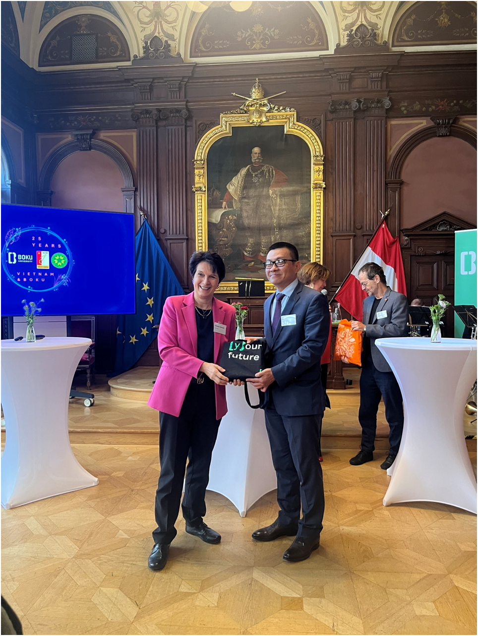 Đại sứ Vũ Lê Thái Hoàng nhận quà lưu niệm của Hiệu trưởng Đại học BOKU