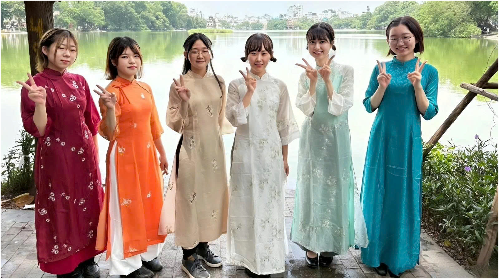 Các nữ sinh ĐH Kagawa đi dạo ngắm Hồ Gươmg trong tà áo dài Việt Nam.
