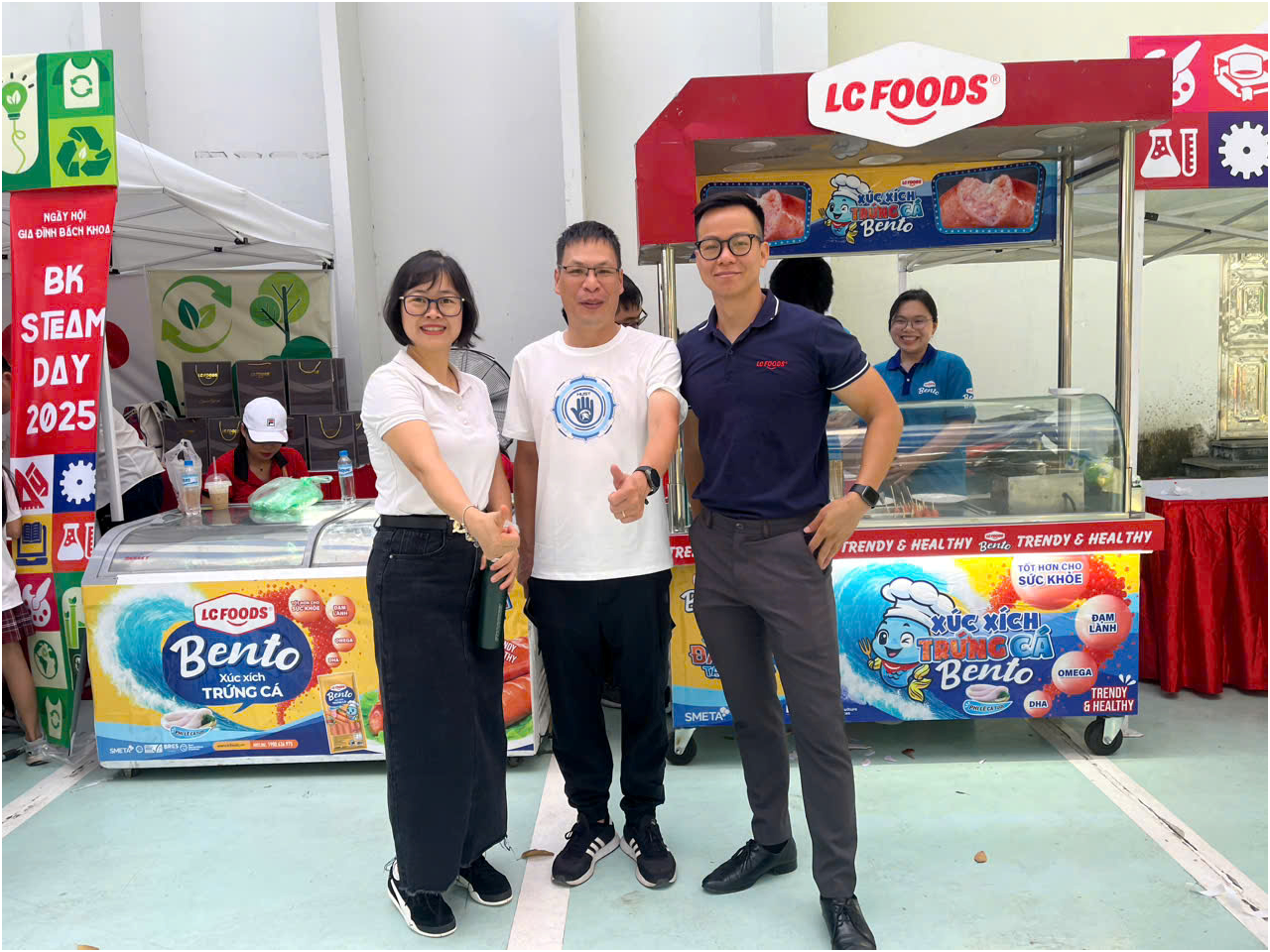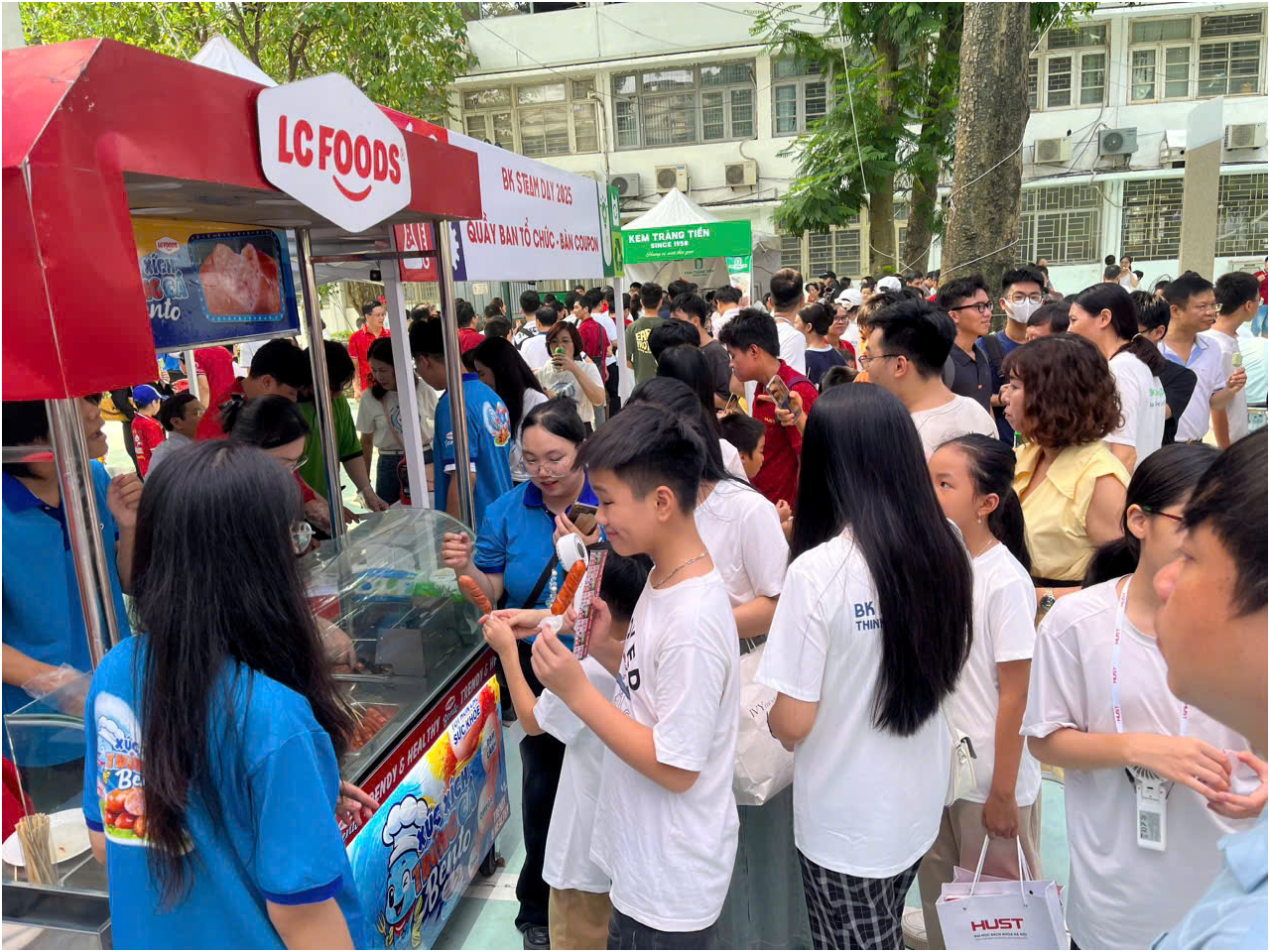 Bên cạnh các hoạt động vui chơi sôi nổi, khu vực ẩm thực là một trong những điểm nhấn của ngày hội. Trong không khí vui tươi, Trường Hóa và Khoa học Sự sống (SCLS) phối hợp cùng nhà tài trợ LC FOODS mang đến gian hàng trải nghiệm với nhiều sản phẩm hấp dẫn. Những món quen thuộc như lạp xưởng tươi, lạp xưởng cay, viên thả lẩu cùng hai sản phẩm mới –Bento xúc xích trứng cá chuồn và Bento xúc xích cá basa – đã thu hút đông đảo các thầy cô và các em nhỏ ghé thăm.