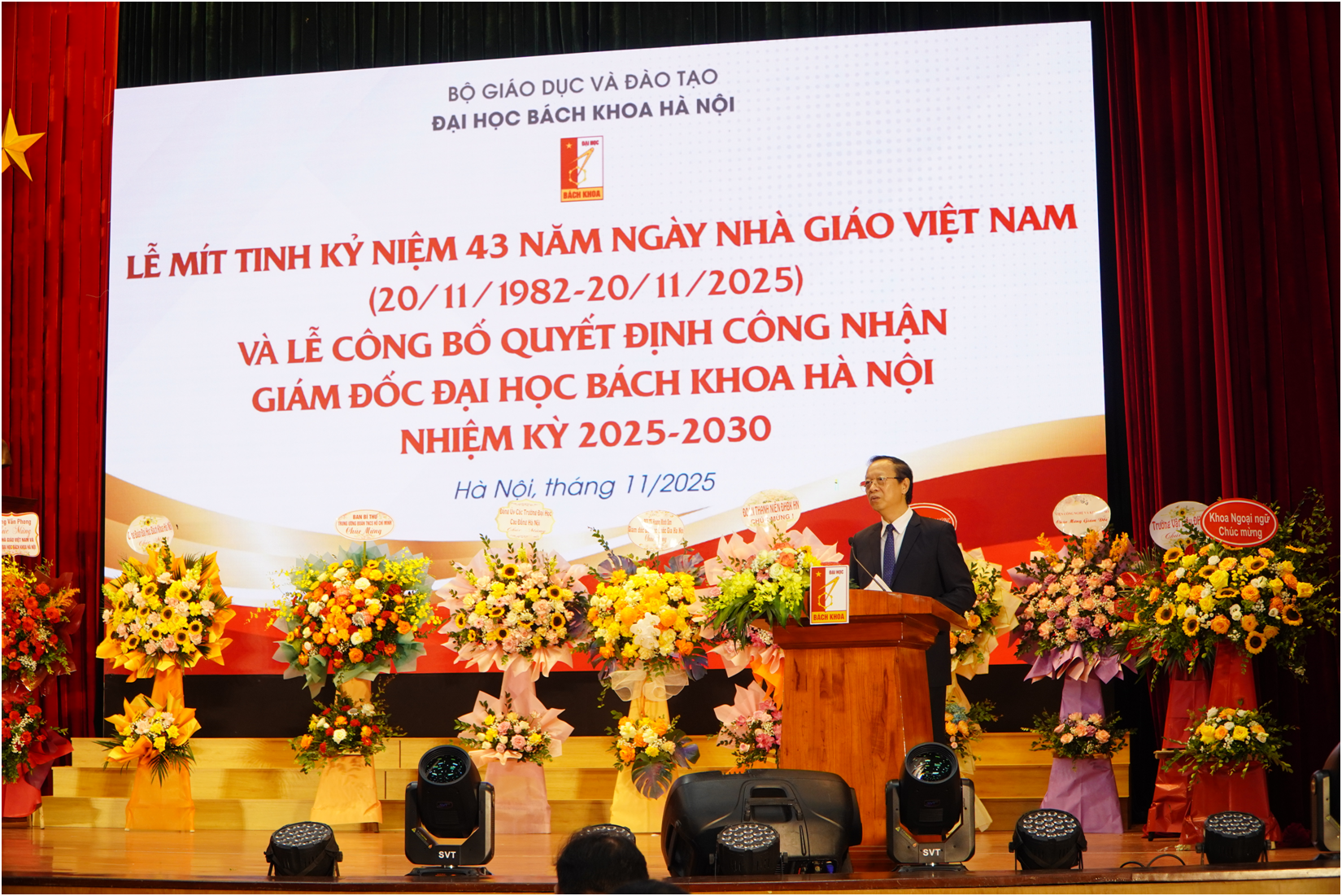 Thứ trưởng Bộ Giáo dục và Đào tạo Phạm Ngọc Thưởng về dự lễ kỷ niệm 43 năm ngày nhà giáo Việt Nam và Lễ công bố quyết định công nhận Giám đốc Đại học Bách Khoa Hà Nội nhiệm kỳ 2025-2030.