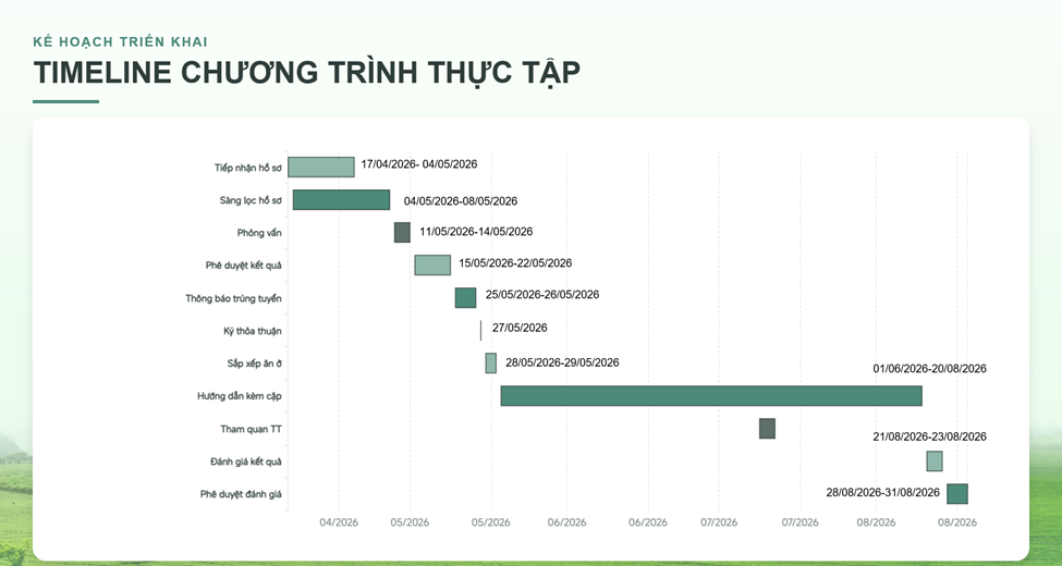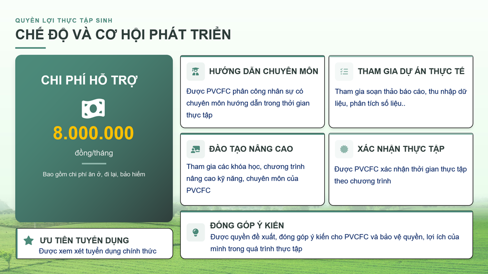 Thực tập sinh trúng tuyển sẽ được hỗ trợ chi phí, hướng dẫn bởi đội ngũ chuyên môn, tham gia các hoạt động chuyên môn thực tế và có cơ hội được xem xét tuyển dụng chính thức sau chương trình.