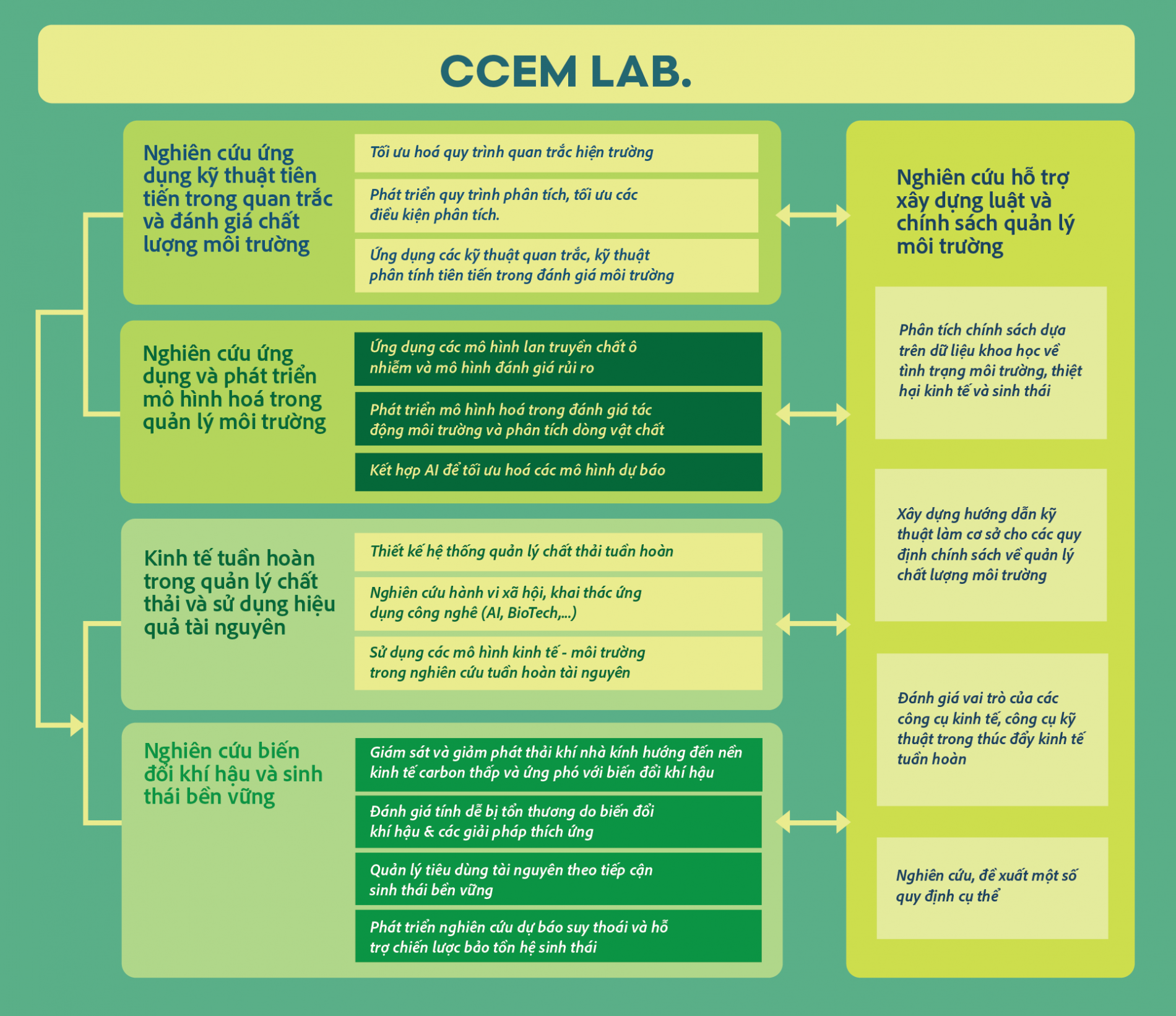 Nội dung phát triển chuyên môn của CCEM Lab. bao gồm: (1) Nghiên cứu ứng dụng kỹ thuật tiên tiến trong quan trắc và đánh giá chất lượng môi trường; (2) Nghiên cứu ứng dụng và phát triển mô hình hóa trong quản lý môi trường; (3) Kinh tế tuần hoàn trong quản lý chất thải và sử dụng hiệu quả tài nguyên; (4) Nghiên cứu biến đổi khí hậu và sinh thái bền vững; và (5) Nghiên cứu hỗ trợ xây dựng luật và chính sách quản lý môi trường. Các lĩnh vực nghiên cứu của PTN được minh họa trong Hình 1 và được mô tả chi tiết trong các tiểu mục sau đây.